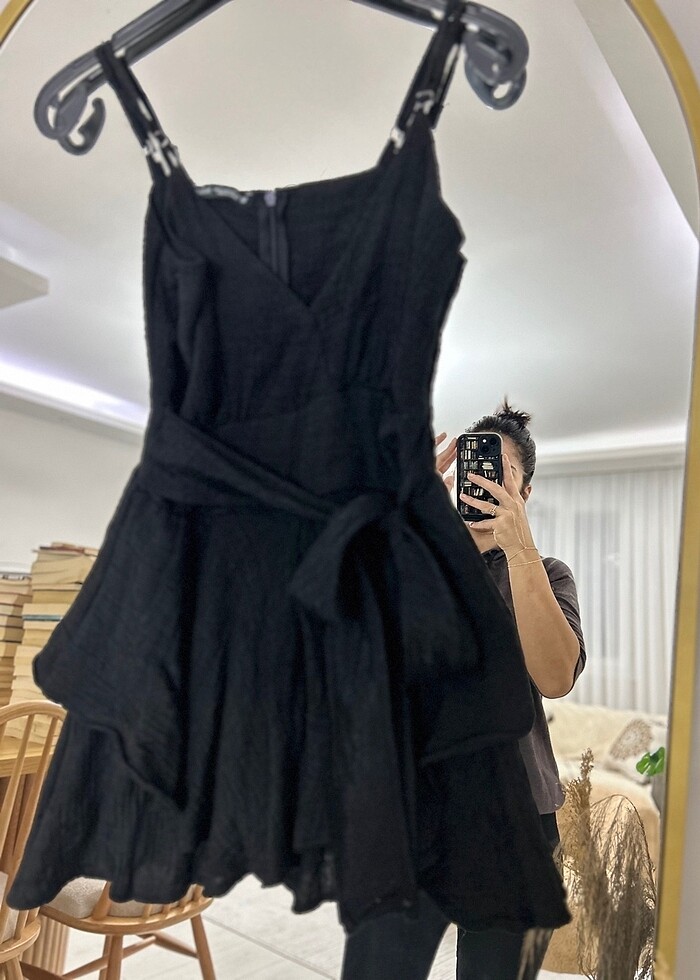 Etek gibi görünüyor katlı aşırı iyi bir duruşu var birkez giydim 2 saat falan yumuşak müslin kumaşı gibi