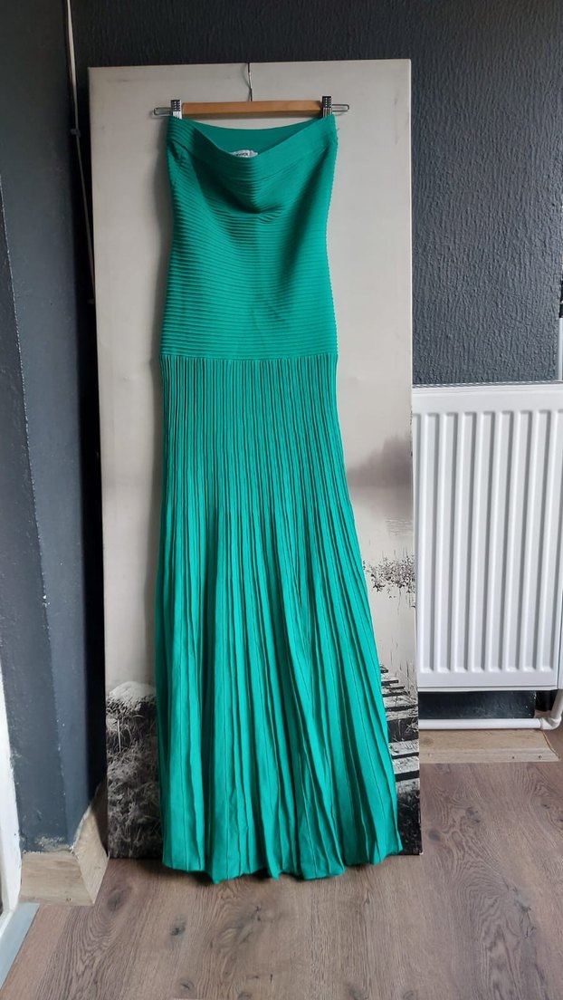 Askılı turkuaz renkli abiye elbise, vücuda oturan üst kısmı ve uzun pilili etek detayıyla dış mekan kullanımı için uygundur. Modern ve renkli bir stile sahiptir.