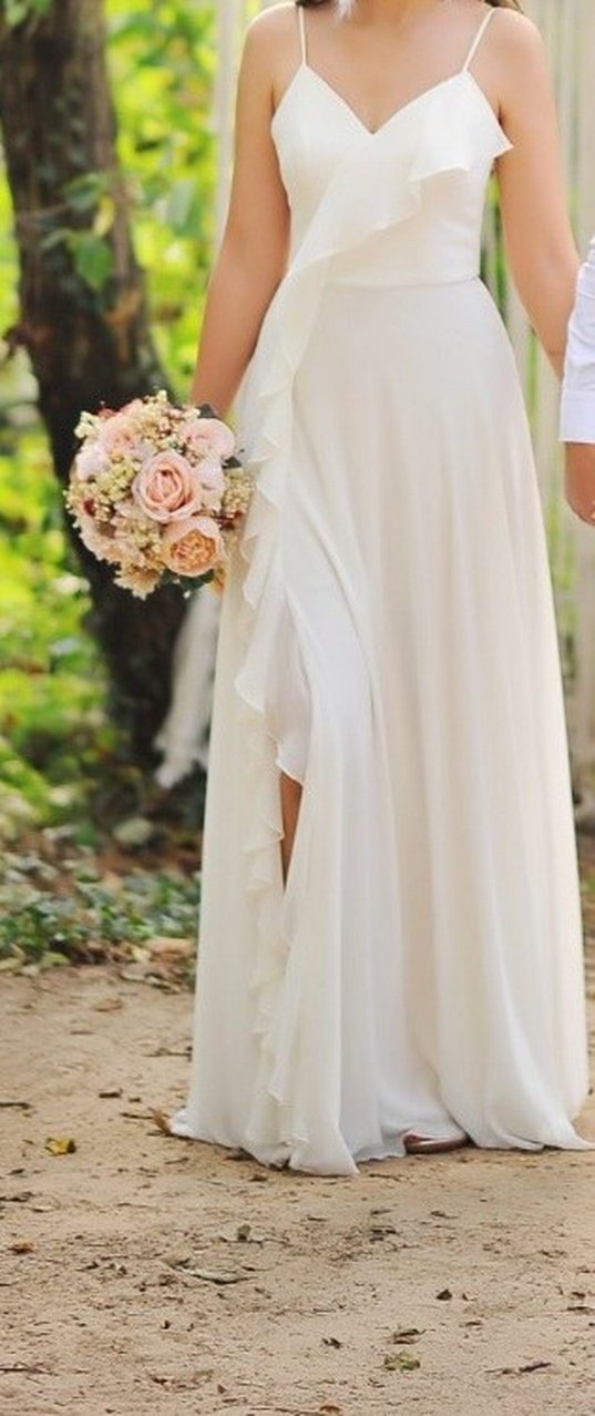 Uzun beyaz A kesim gelinlik, askılı yaka ve ince askılarla, bol kesim ve sade bohem tarzda tasarlanmıştır.