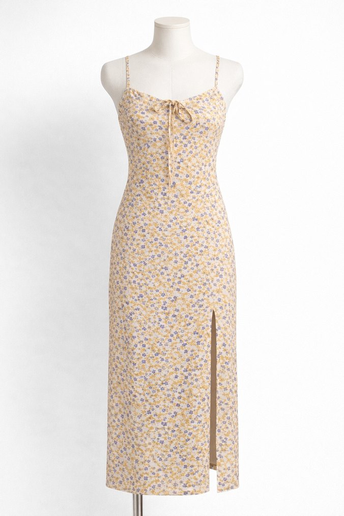 V İnce askılı, uzun bej elbise. İnce çiçek deseni ve yırtmaç detayı ile rahat kullanıma uygun.Astarsız Bershka Elbise