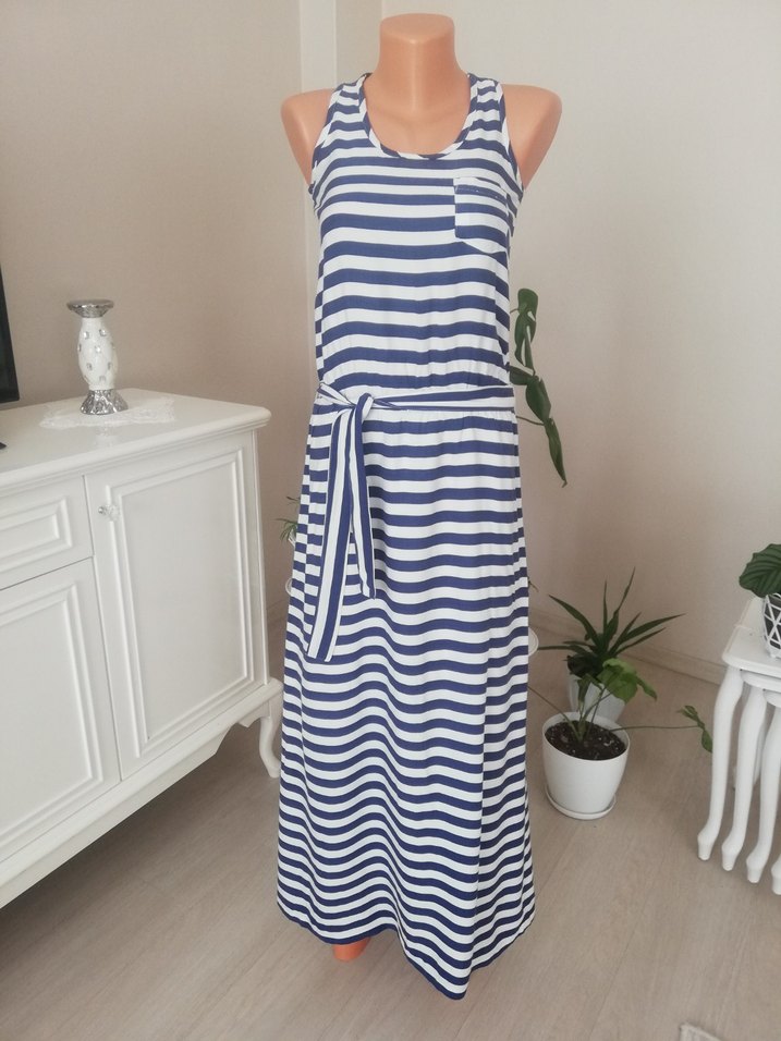 Hafif mavi çizgili, kolsuz uzun elbise XSİDE Marka içi astarlı kumaşı rahat hem şık hem spor bir elbise beli kemerli. 38 yazıyor ama 34-36 daha uygun ölçüleri dikkate alınız. İki kol arası 40 Bel lastikli açınca 38cm Boy 140cmdir.
