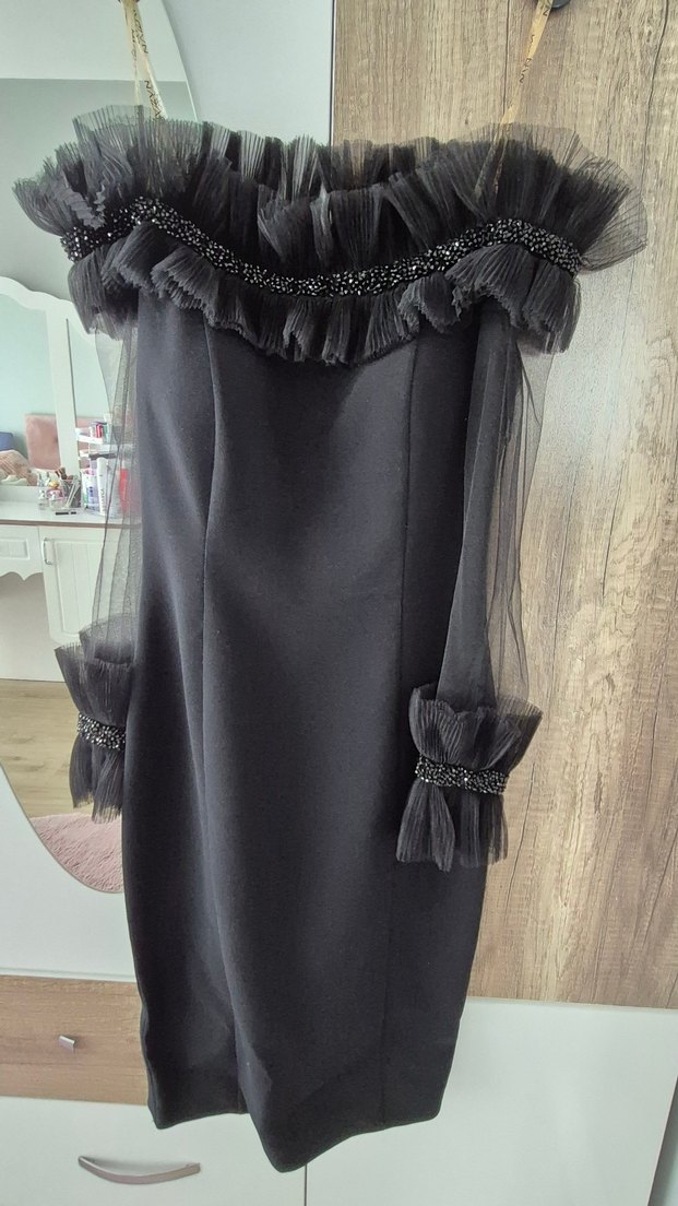 Volanlı detaylı, askısız ve işlemeli siyah uzun abiye elbise, gotik tarzda parti için uygun şık bir seçimdir.