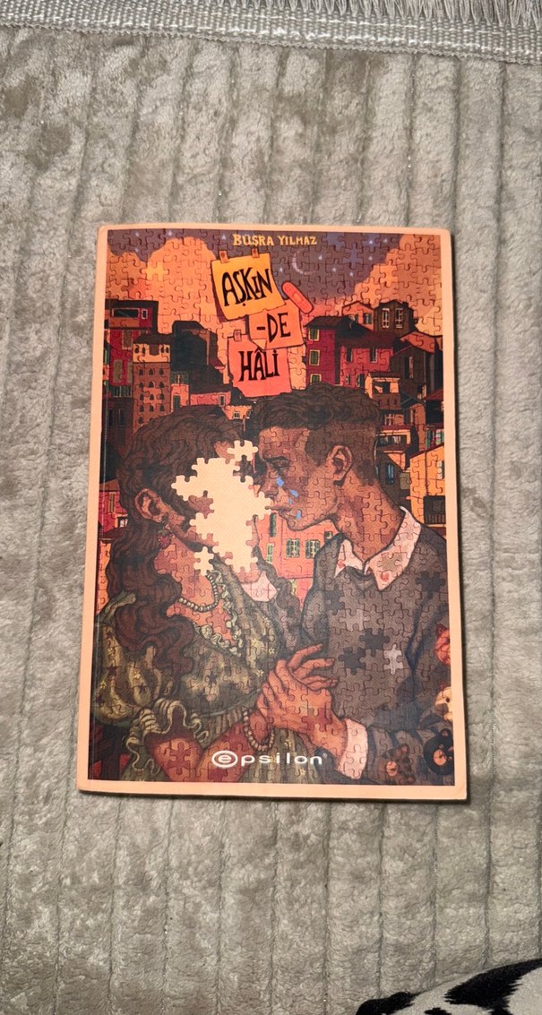 Büşra Yılmaz'ın 'Aşkın Halı' adlı romanı, kapakta yüzü eksik bir yapboz parçası olan iki kişinin karşı karşıya olduğu bir illüstrasyona sahip.