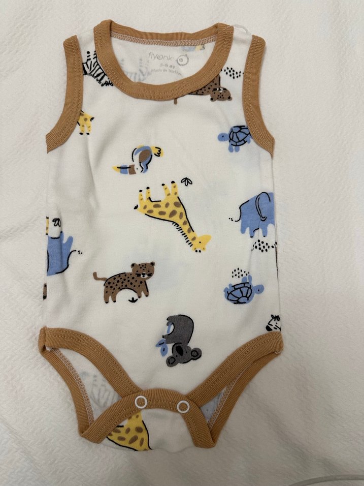 Askısız, hayvan desenli bebek body, kahverengi kenar detayları ve tokalı tasarıma sahiptir. Yumuşak sentetik kumaştan üretilmiştir. Hiç giyilmedi