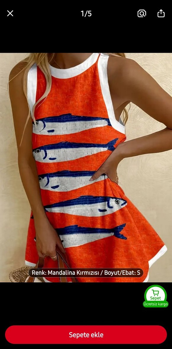 Askısız, kısa mini elbise, bol kesim ve drapeli tasarıma sahiptir. Mandalina kırmızısı parlak renkte, balık desenli, sentetik kumaştan yapılmıştır.