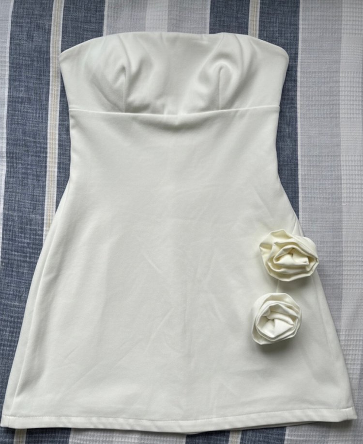 Ürün yeni ve hiç kullanılmamıştır. Oldukça zarif ve şık bir parçadır. Özel tasarım gül detayları ile süslenmiştir.Askısız, mini boy beyaz elbise, vücuda oturan kesim ve midi uzunlukta. Kolsuz tasarımda, çiçek detayları bulunur, minimalist bohem tarz için uygun. Bel:35 cm, boy:67 cm, göğüs:37 cm’dir. Yumuşak ve pamuklu bir kumaşa sahiptir. Dekolte kısmında yapışkanlı bir bant şerit olduğu için elbise vicuda tam oturur kayma düşme yapmaz.