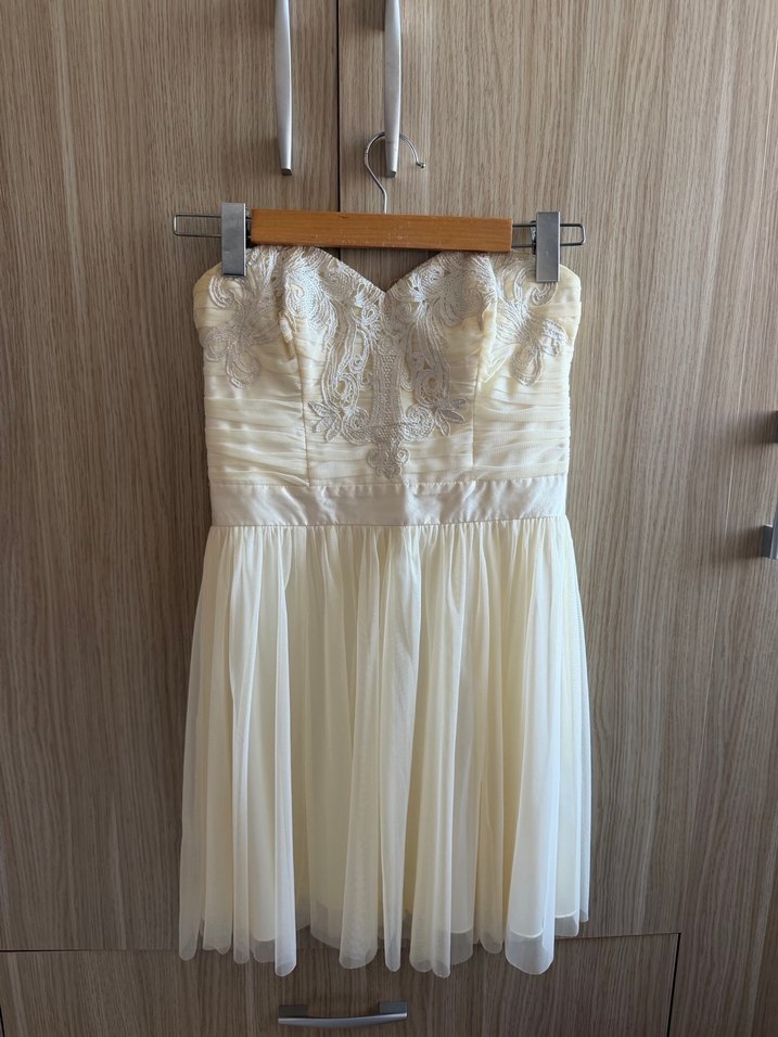 Askısız, beyaz mini gelinlik; dantel detaylı dar üst kısmı ve uçuşan midi eteğiyle vintage ve modern klasik tarzı bir araya getiriyor.