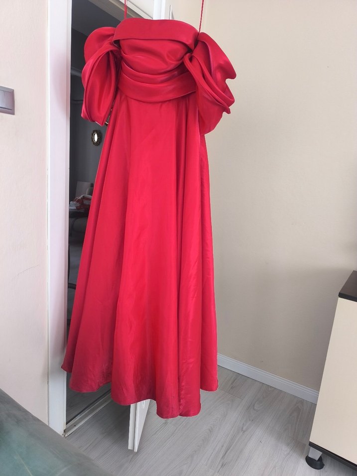 Askısız, salaş kesim, uzun kırmızı abiye elbise, parlak kumaş ve drapeli detaylara sahiptir. Düğünler için uygundur, kolsuz ve modern klasik tarzda.