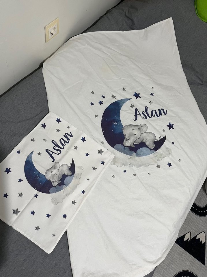 Beyaz battaniye ve yastık seti, ay, yıldızlar ve fil desenine sahiptir. Yumuşak kumaş çocuklar için rahatlık sağlar. "Aslan" yazısı baskılıdır. 75x110 yorgan kılıfı. Yastık kılıfıda 35x40 ölçülerdir. Çarşafsızdır. Sadece yorgan kılıfında üç adet leke var. Fotoğrafını koydum. Gerçekten makinem temizlemiyor. Yoksa leke çıkar. Trnd yol dan aldım 2024 yaz ayında. Dekor olsun diye kullandım bebeğim hiç yastık yorgan kullanmadı.