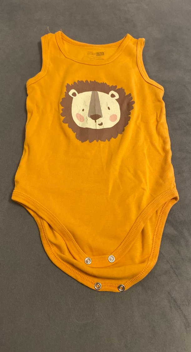 Kolsuz, yuvarlak yakalı sarı bebek body, önünde renkli aslan baskısı bulunur. Yumuşak ve sıcak kumaştan, alt kısmında çıtçıtlıdır.