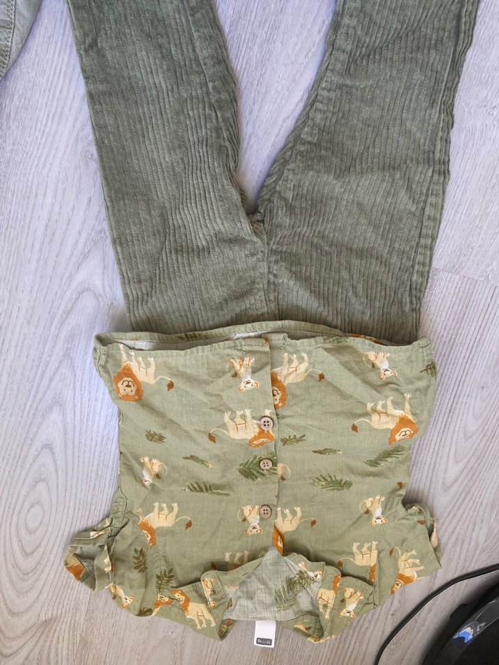 Yüksek yakalı ve uzun kollu, düğmeli ön kısmı olan bebek takımı. Yumuşak tekstil kumaş, gri zemin üzerine aslan desenli, rahat normcore tarzda.