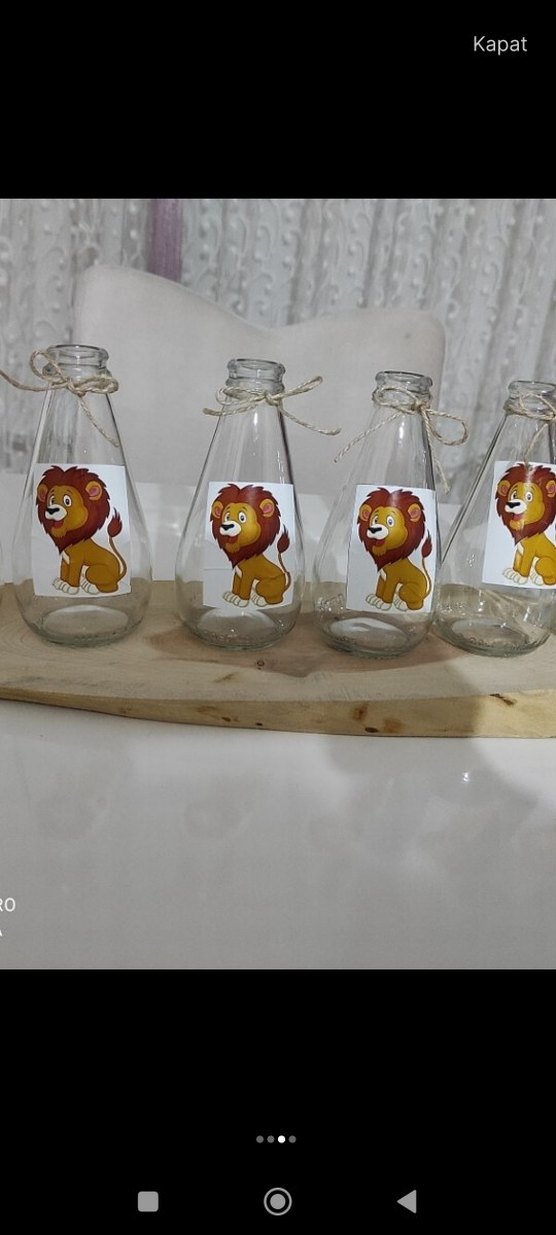 Cam bebek şişeleri, üzerinde renkli aslan figürü ve boyun kısmında ip bağı ile tamamlanmıştır. Her şişede camel renkli aslan baskısı bulunur.