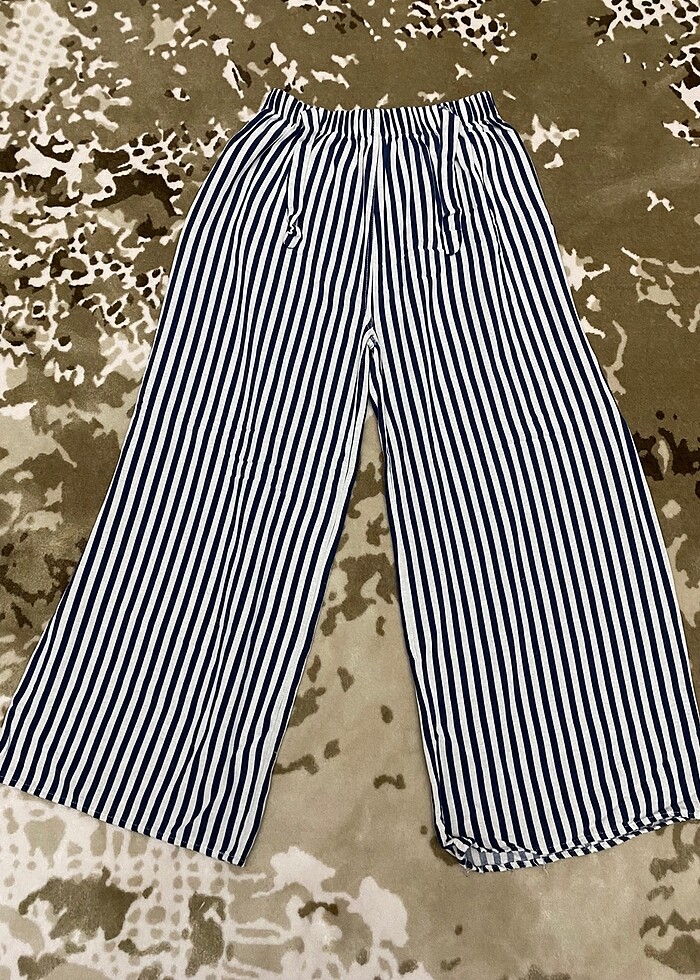 Lacivert Çizgili Beli Lastikli Bağcık Detaylı Bol Pantolon 0 Vizkos