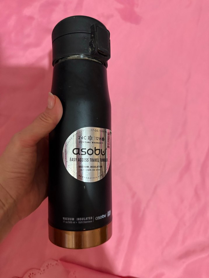 Asobu siyah termos matara, kolay erişim sağlayan kapak ve vakum yalıtımı ile içecekleri sıcak veya soğuk tutar. Seyahat için dayanıklı ve şık tasarıma sahiptir.