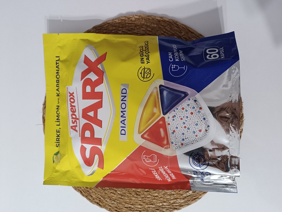 Renkli Asperox Sparx Diamond bulaşık tabletleri, üç farklı temizleme bölmesiyle etkili yıkama sağlar. 60 yıkama kapasitelidir.