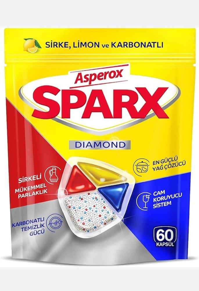 Asperox Sparx bulaşık makinesi kapsülleri, limon, sirke ve karbonat içerir. Güçlü yağ çözücü, cam koruyucu sistem ve mükemmel parlaklık sağlar. 60 kapsül.