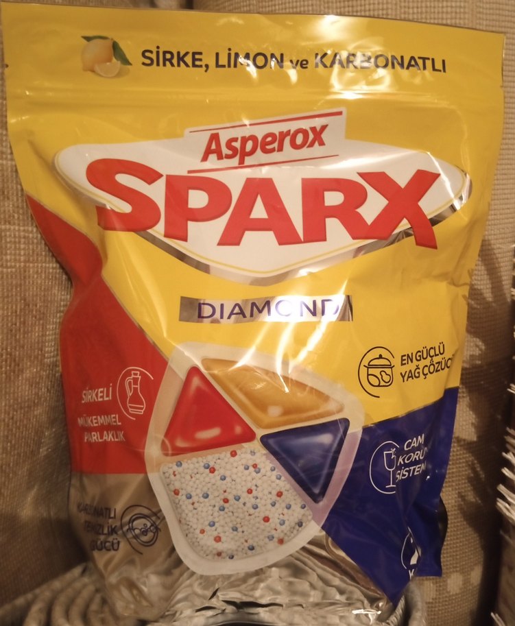 Asperox Sparx tozu sirke, limon ve karbonat içerir. Güçlü yağ çözücü ve cam koruyucu özelliklere sahiptir, mükemmel parlaklık sağlar. 72 adet kapsül