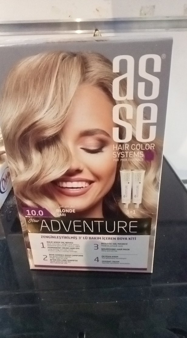 Asse Adventure 10.0 Sarı saç boyası seti, üç aşamalı renk ve bakım içerir. Doğal sarı ton ve besleyici formül sunar.