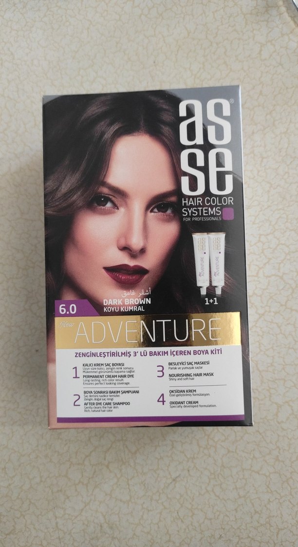 Asse Adventure 6.0 koyu kumral saç boyası, zenginleştirilmiş 3 aşamalı bakım sistemi ile kalıcı krem boya, besleyici şampuan, saç maskesi ve oksidan krem içerir.