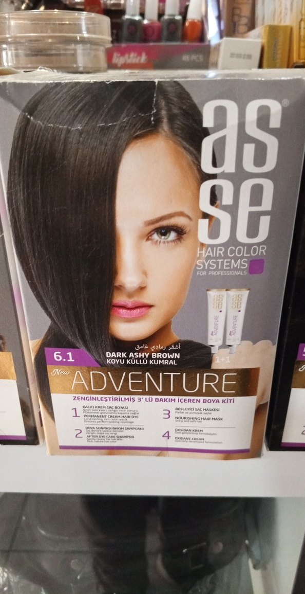 Asse Adventure 6.1 koyu küllü kumral saç boyası zenginleştirilmiş 3 aşamalı bakım içerir ve saçı besler.