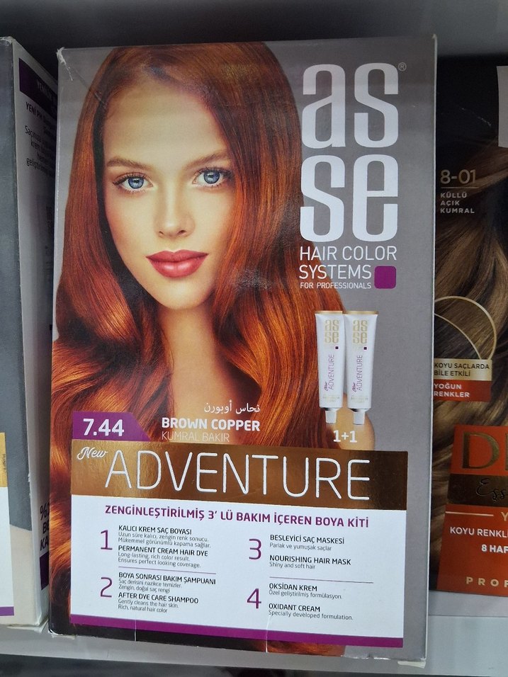 Asse Adventure 7.44 Koyu Kızıl Bakır saç boyası, zenginleştirilmiş formülü ve kalıcı krem, şampuan, besleyici saç maskesi ve oksidan krem içeren 3 aşamalı bakım kiti ile profesyonel sonuçlar sunar.