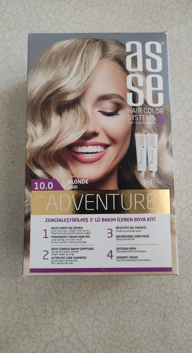 Asse Adventure 10.0 sarı saç boyası kiti, kalıcı krem boya, besleyici saç maskesi, boya sonrası bakım şampuanı ve oksidan krem içerir. 3 aşamalı bakım sağlar. ♀️