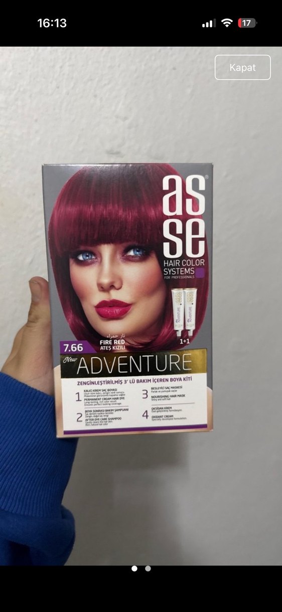 Asse Adventure 7.66 Ateş Kırmızısı saç boyası, zenginleştirilmiş 3'lü bakım kitiyle canlı ve parlak kırmızı ton sağlar. Özenli paketlenir 1 adet gönderilir Ürün içeriği 2. Görselde mevcut Sıfır kullanılmamış ürün