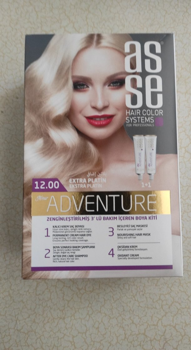 Asse Extra Platin saç boyası seti; kalıcı krem saç boyası, boya sonrası bakım şampuanı, besleyici saç maskesi ve oksidan krem içerir.