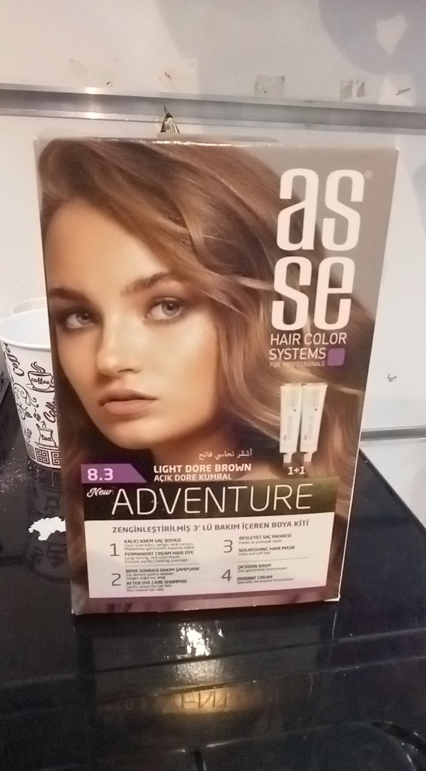 Asse 8.3 Açık Küllü Kahve saç boyası, zenginleştirilmiş 3'lü bakım içeren boya kiti sunar. Renk kremi ve bakım ürünleri dahildir.