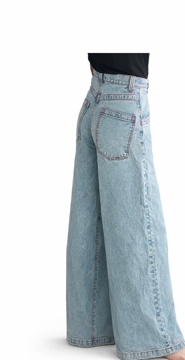 Çok az giyildi bi sorunu yok Düğmeli ön kısmı ve midi boyu ile bol kesim kadın kot pantolon. Gri-mavi tonlarında, günlük ve sokak stiline uygun rahat kesim.