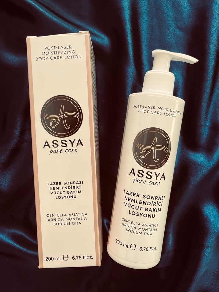 ASSYA lazer sonrası nemlendirici vücut losyonu, Centella Asiatica, Arnica Montana ve Sodium DNA içerir. Cildi yatıştırır ve nemlendirir. 200 ml pompalı şişede.