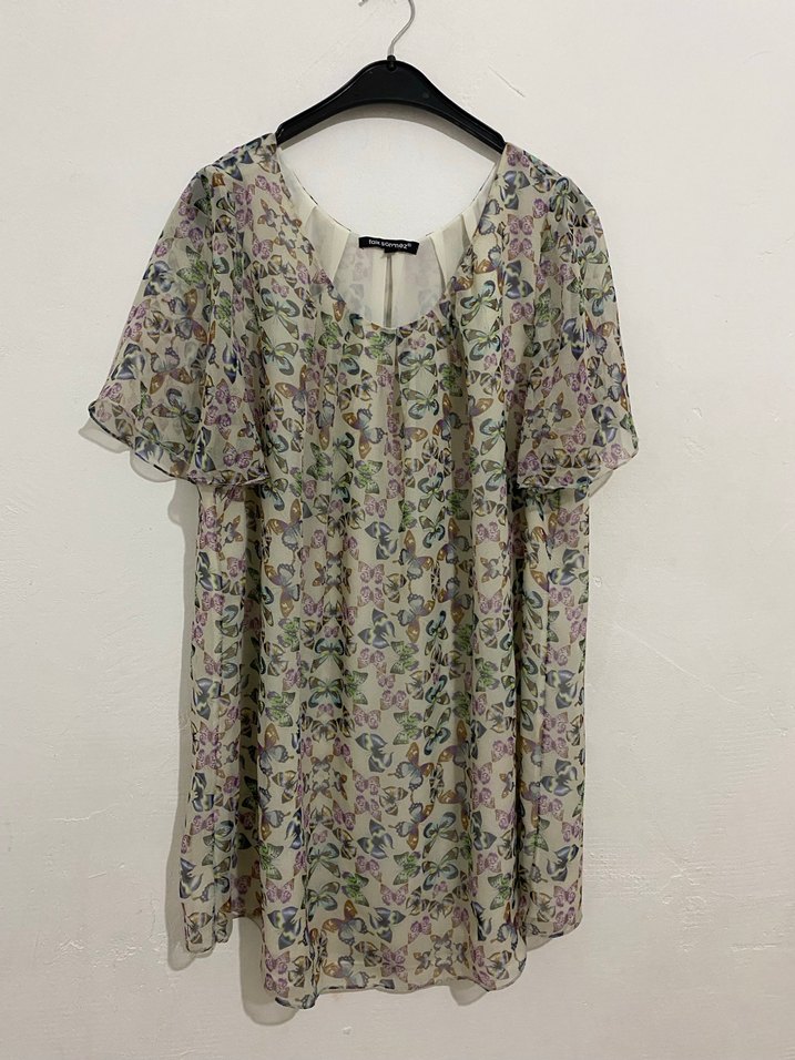 Vkısa kollu, bol kesim Yumuşak sentetik kumaştan, pastel çok renkli batik desenli ve drapeli tasarıma sahiptir.