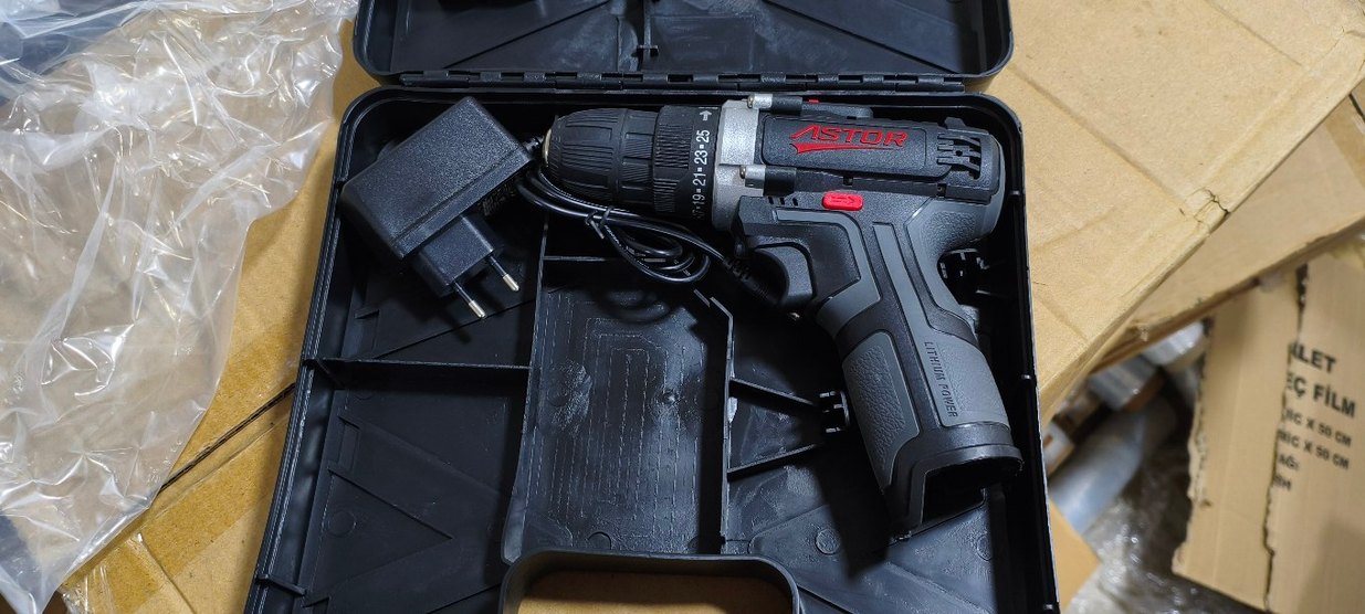 Astor marka siyah şarjlı matkap, ayarlanabilir tork ayarları ve şarj cihazı ile birlikte kutusunda sunulur.
