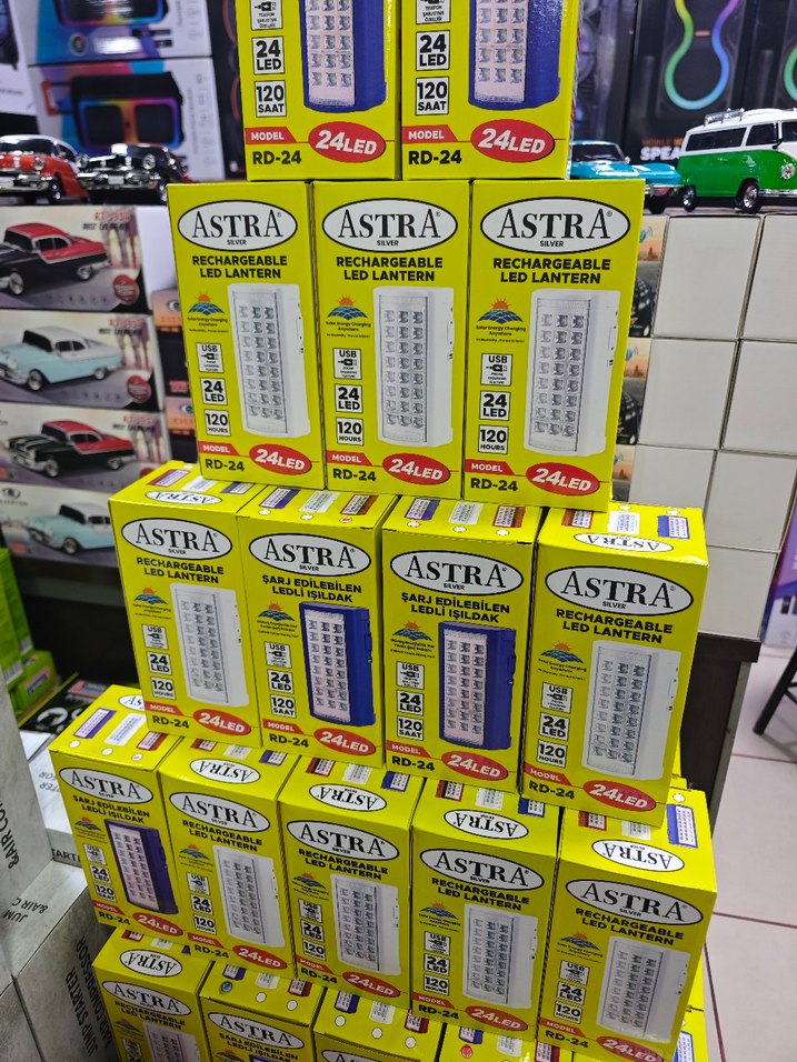 Astra sarı renkte, 24 LED ışıklı, şarjlı ve dayanıklı bir LED fenerdir. Uzun süreli aydınlatma sağlar.