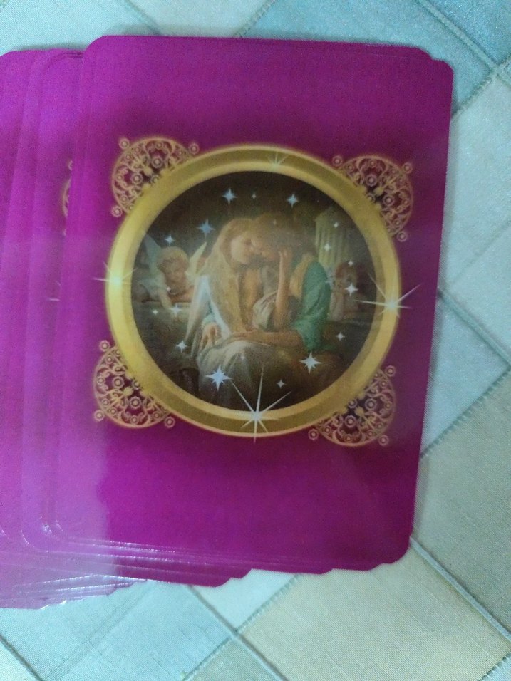 Mor zemin üzerinde altın çerçeveli mistik resimlere sahip astroloji ve kehanet kartları seti. aşk melekleri destesi. yeni