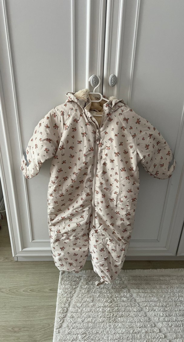 Beyaz, pastel tonlarda desenli, düğmeli ve yakası notched lapel kesim bebek kız tulumu. ❄️ 0 etiketli son fiyattır
