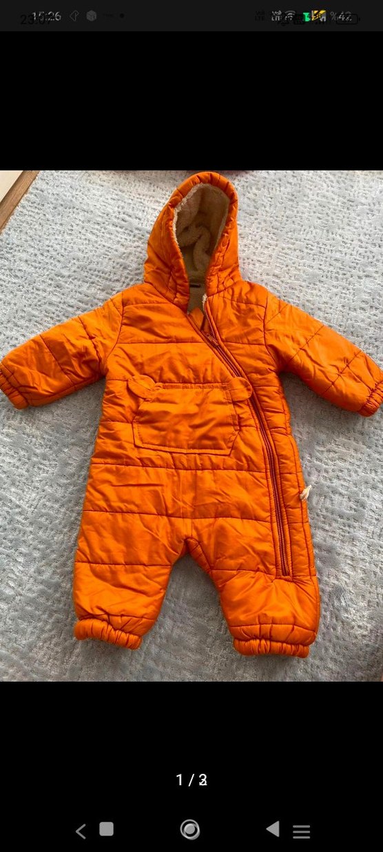 9-12 Ay.Renkli turuncu bebek tulumu, fermuarlı ve yumuşak polar astarlı. Kapüşonlu ve ön cepli, sokak modası tarzında sıcak tutar. ❄️