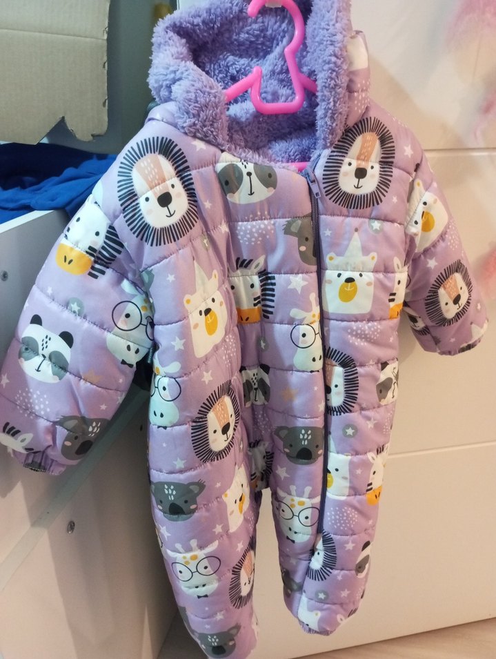 Mor pastel hayvan desenli bebek tulumu, kürklü detaylı ve notch yakalı. Soğuk havalar için yumuşak ve sıcak tutar. ❄️