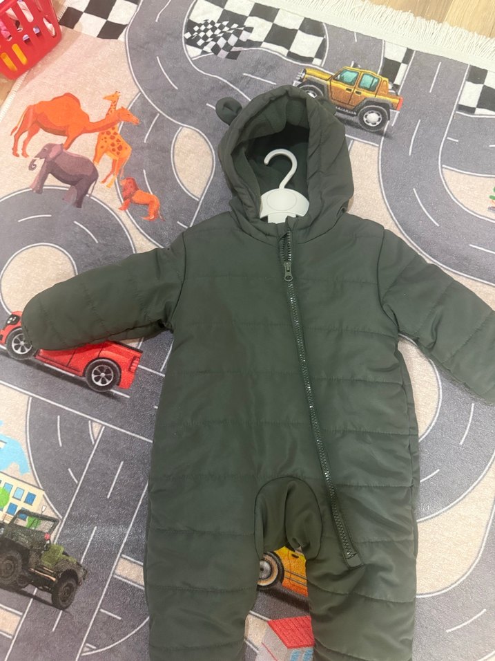 Koyu yeşil renkli,içi polarlı bebek astronot mont. Yumuşak ve sıcak kumaş, kapüşonlu ve tam boy fermuarlı,yurt dışından hediye gelmişti hiç kullanılmadı