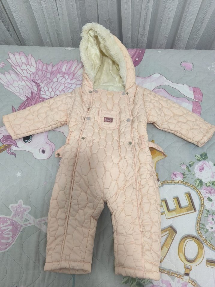 Pastel pudra renkli, kapüşonlu ve kürklü detaylı bebek tulumu. Yumuşak ve sıcak iç yapıya sahiptir, desensiz tasarımı vardır. ❄️