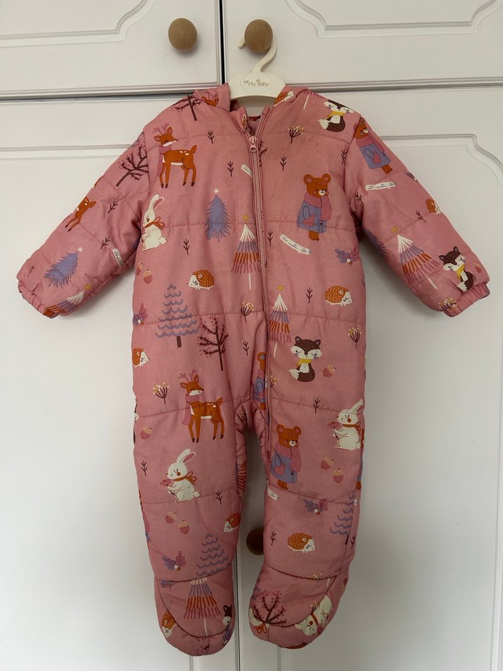 Pembe renkte, orman hayvanları desenli, bisiklet yaka ve örme detaylı bebek tulum. Temizdir herhangi bir defosu yoktur