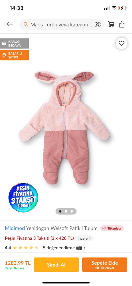 Pastel pembe renkte, kapüşonlu ve kulak detaylı kürklü bebek tulumu. Düz desensiz, patikli ve önden fermuarlı yapısı ile kullanımı kolaydır. 9-12 beden fakat 6-9 bir bebeğe daha rahat olur çünkü benim bebeğim 9 aylık 70cm boyu 8.400 kg normalde 9-12 giyiyor fakat bu tulum dar geldi ayak ve bacak kısımları özellikle. Eşim almış bedeni olur sandım yıkadım ama malesef giydiremedim yepyeni