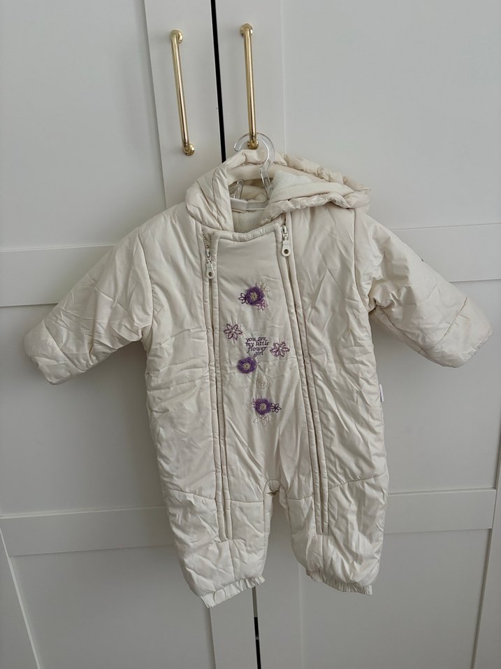 Pastel beyaz renkte, yakası kesik ve nakışlı desenli bebek tulumu. Ön kısmı fermuarlı, kolay giyilip çıkarılır.