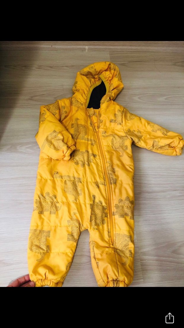 Parlak sarı renkli, fermuarlı bebek astronot tulumu, yumuşak fleece astarlı ve kapüşonludur. Sokak tarzına uygun, hayvan desenleriyle sade görünümlü.
