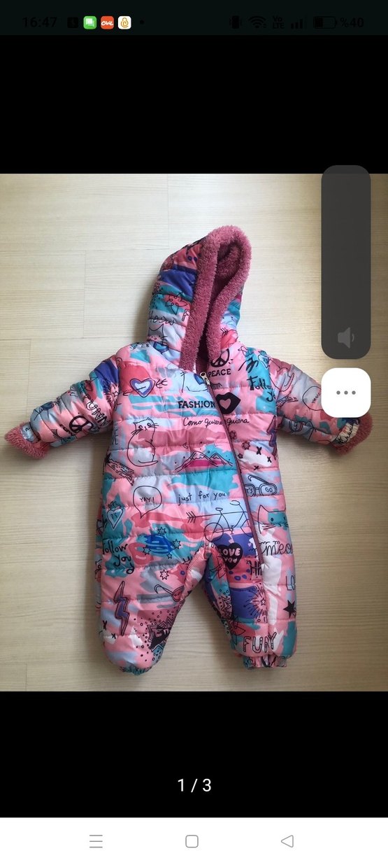 Kapüşonlu ve fermuarlı, renkli desenlere sahip bebek tulumu. Yumuşak ve sıcak kumaştan üretilmiştir. ❄️