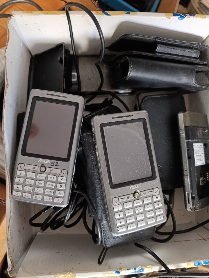 durumu bilinmiyor bozuk fiyatına satış Kutu içinde şarj cihazları ve kılıflarla birlikte iki adet gri Asus S2 fiziksel tuşlu telefon.