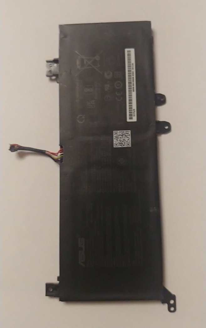 Bağlayıcı ve güvenlik etiketleri bulunan siyah Asus laptop bataryası. Belirli Asus modelleriyle uyumludur.
