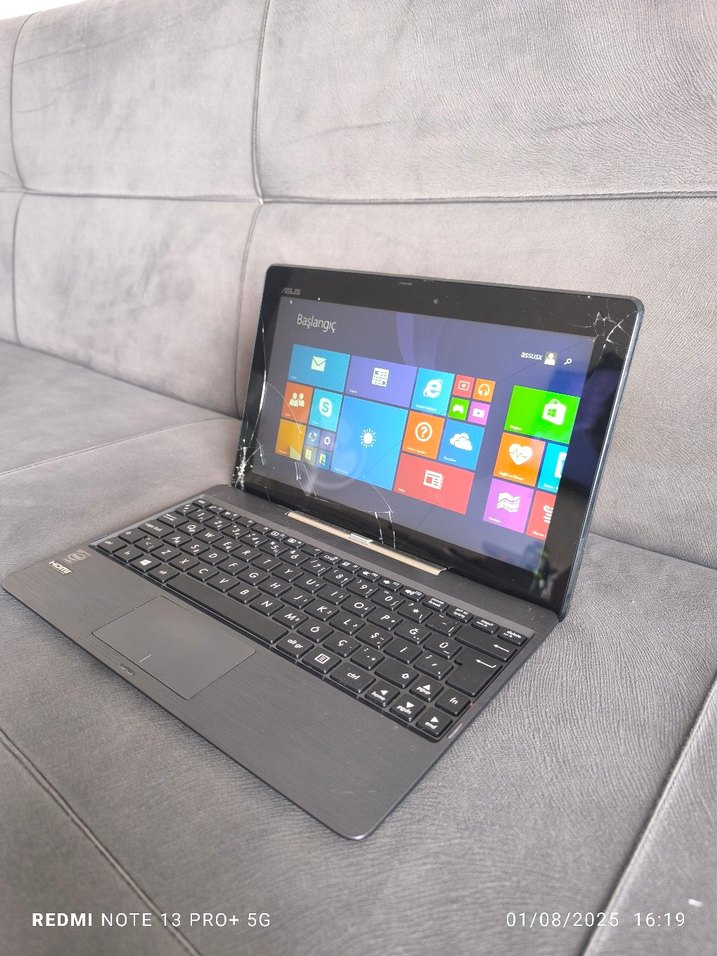 Gri renkli ASUS dizüstü bilgisayar, Windows arayüzlü dokunmatik ekran ve tam klavye içerir. Ekranda çatlaklar bulunmaktadır. Windows 10 işletim sistemi ✅ 1 GB ram DDR3 ✅ Z3537 Intel işlemci 1.88 GHz 32 GB rom hafıza artirilabilinir Mini SD yuvasi mevcut 10.1 ince ekran ekranın Dokunmatigi çalışmıyor çatlak mevcut ✅ şarj çok iyi gidiyor gündelik video YouTube ve filim için ideal