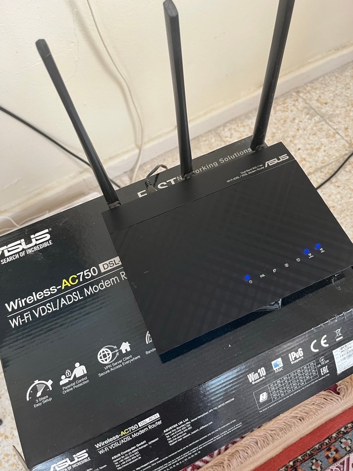 ASUS Wi-Fi AC750 modem router, VDSL/ADSL destekli, üç harici antenli, stabil kablosuz bağlantı sağlar. Oyun ve internet için uygundur.