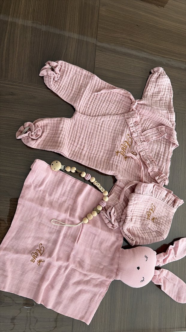 Pastel pembe renkte, nakışlı ve zincir detaylı uzun kollu bebek kıyafet seti. Yumuşak kumaşıyla rahatlık sağlar.